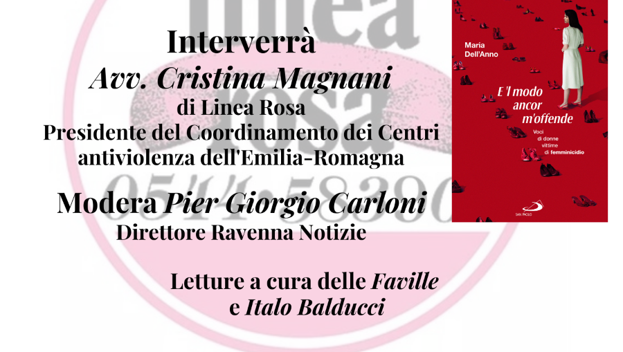 “E ‘l modo ancor m’offende” è anche il titolo del libro di Maria Dell’Anno che verrà presentato per l’occasione, in compagnia del moderatore Pier Giorgio Carloni Direttore di Ravenna Notizie e con l’intervento dell’Avvocata Cristina Magnani di Linea Rosa e Presidente del Coordinamento dei Centri antiviolenza dell’Emilia-Romagna.