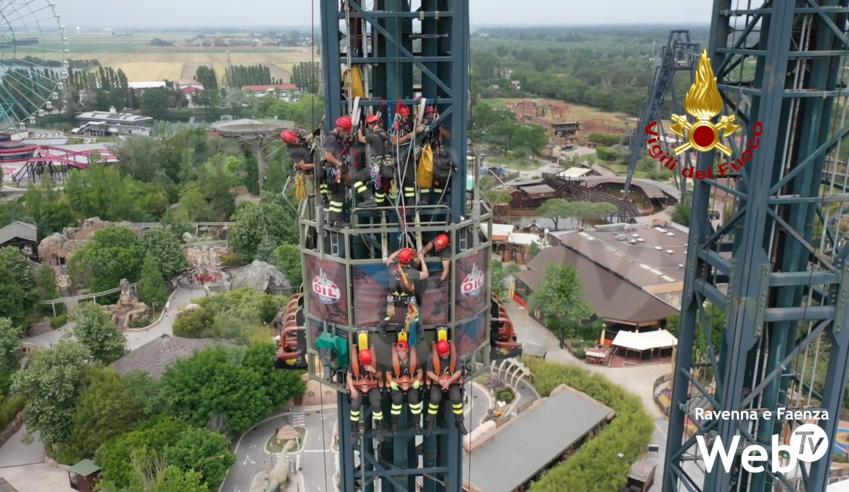 Un gruppo di persone intrappolate a 60 metri d’altezza, un’operazione di salvataggio al contempo pericolosa e “spettacolare”. Si tratta dell’esercitazione andata in scena a Mirabilandia da parte dei Vigili del Fuoco che hanno simulato un intervento di recupero di tre persone intrappolate in cima all’attrazione “Torri Gemelle”.