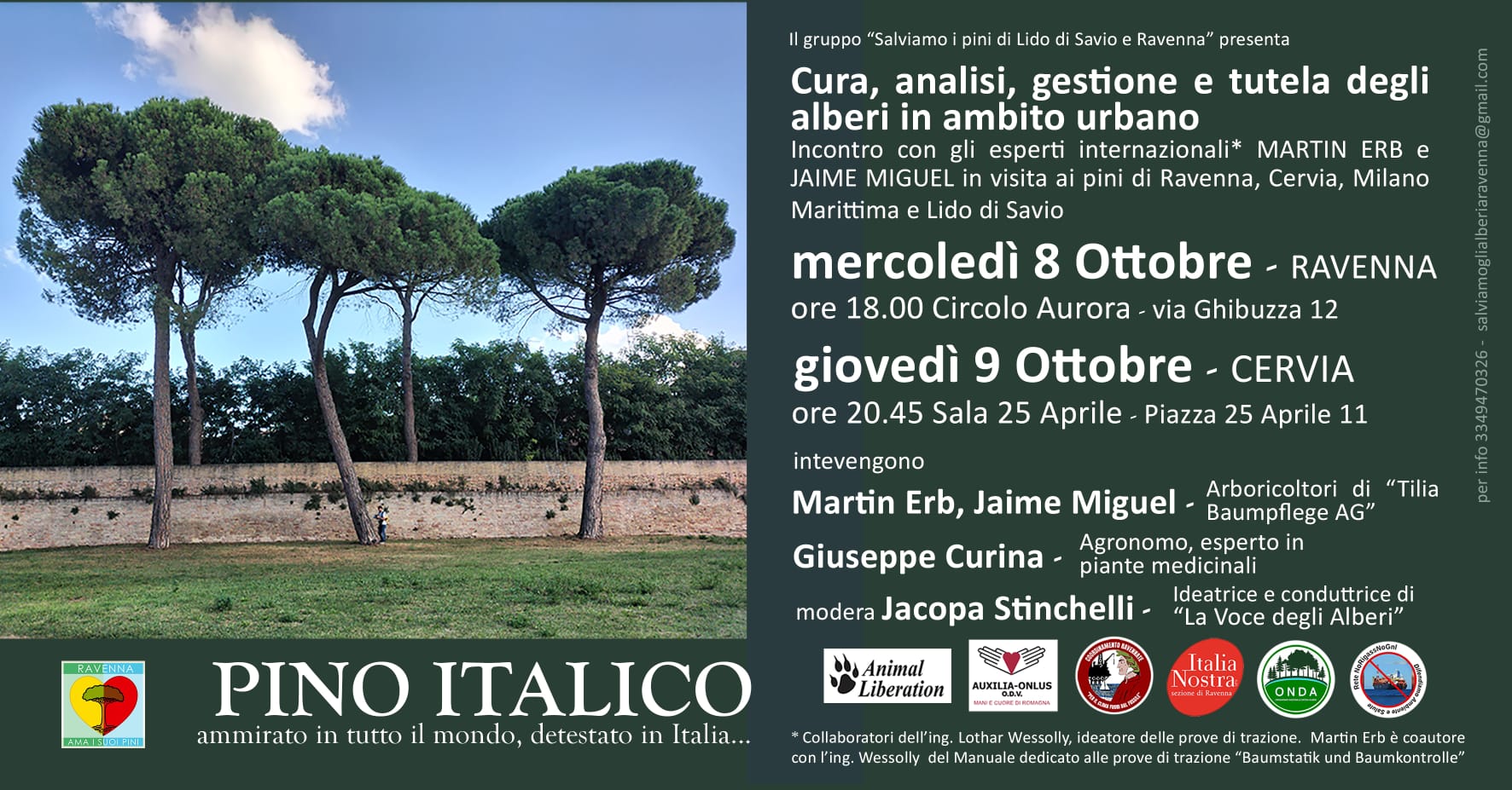 Agli incontri interverrà anche il dottor Giuseppe Curina, agronomo ed esperto di piante medicinali, che illustrerà le proprietà dei pini domestici per la salute. Moderatrice Jacopa Stinchelli, curatrice artistica, autrice e conduttrice della trasmissione radiofonica “La Voce degli Alberi”, nonché attivista in prima linea per la tutela degli alberi di Roma, la sua città, dove proprio in questi giorni si è consumato uno sconvolgente abbattimento attorno al Mausoleo dell’imperatore Augusto, colui che nel 27 a.C. stabilì a Ravenna la flotta imperiale, ridotto ad una sorta di enorme posacenere dopo la rimozione pressoché totale di numerosissimi cipressi storici.