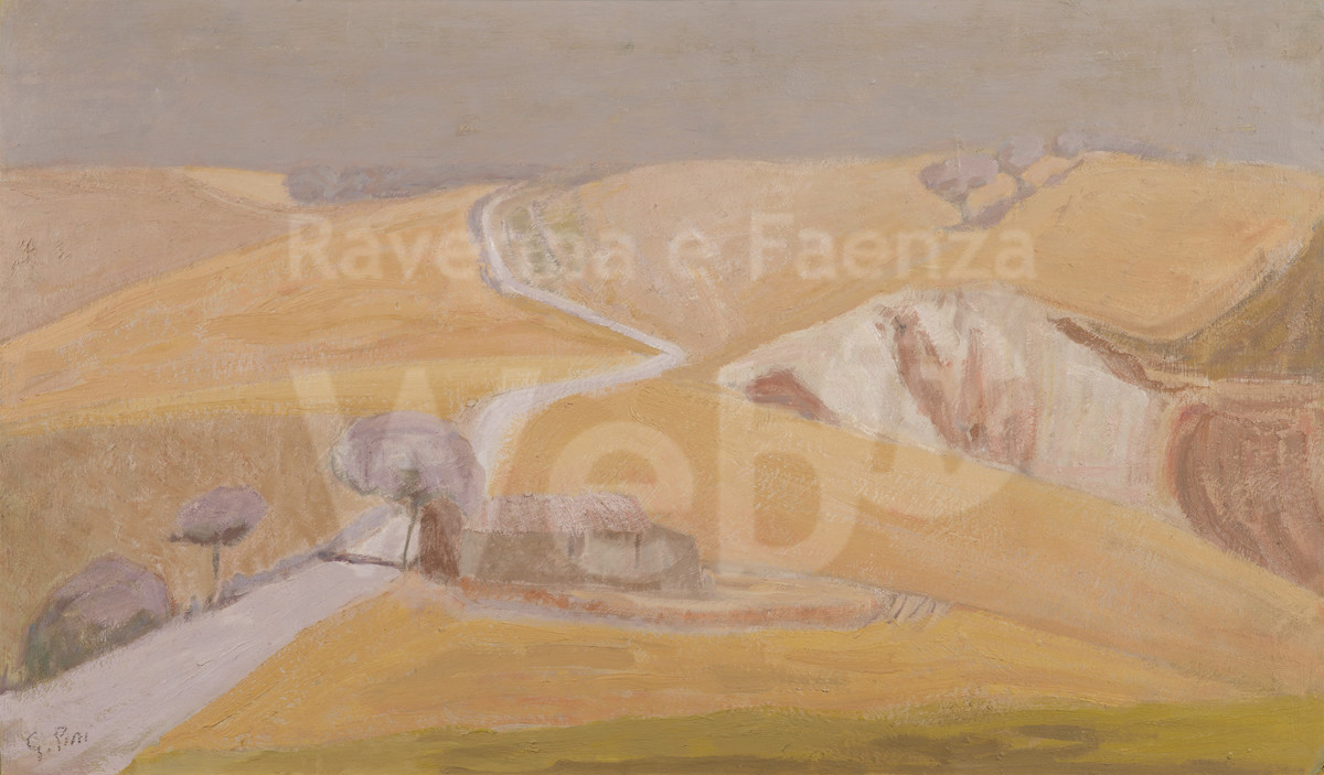 Dopo gli studi classici, Giovanni Pini, originario di Solarolo, si laureò in Lettere antiche all’Università di Bologna. Iniziò la sua carriera come docente di greco e latino prima nei licei di Fermo e Cesena per poi arrivare al Torricelli di Faenza, dove concluse il suo impegno nel 1989. E’ questo l’anno nel quale la sua carriera di pittore decollò, pur avendo coltivato da sempre il disegno e la pittura, raggiungendo ben presto la sua cifra stilistica personalissima. Avendo iniziato a muovere i primi passi nel mondo dell’arte da autodidatta, Pini si sentì svincolato da qualsiasi legame con la tradizione moderna e contemporanea e ancor di più dal mondo del mercato dell’arte. Questo lo portò a percorrere suoi interessi personalissimi, seguendo pulsioni che lo portano verso una pittura figurativa che ha per unici soggetti i luoghi e i paesaggi più immediatamente vicini a Faenza. Alla pittura Pini affiancò poi i suoi disegni a matita e i collage, ottenuti, come spesso amava ricordare, raccogliendo giornali e parti di riviste direttamente dalla strada che mescolava con intonaci, sabbie e colori e pastelli fabbricati personalmente miscelando terre naturali, sabbie, colle e prodotti commerciali.