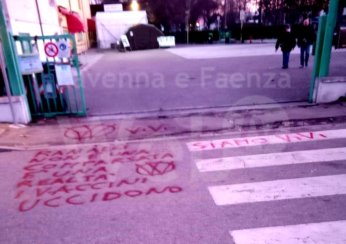 Nuove scritte No Vax davanti a un centro vaccinale in Romagna.