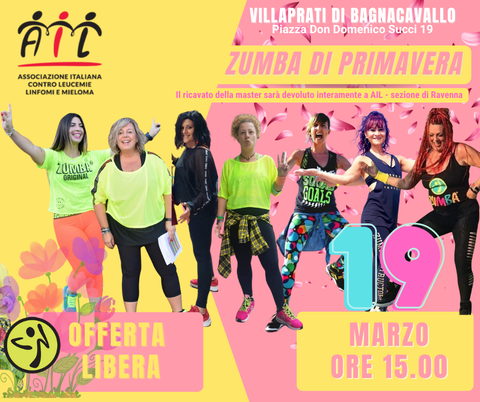 “Domenica 19 Marzo alle ore 15.00, in occasione della Festa d’sa Jusef a Villaprati e in collaborazione con l’Associazione l’Incontro,  si terrà la seconda edizione di ZUMBA DI PRIMAVERA che quest’anno ha lo scopo di raccogliere i fondi per AIL – Associazione Italiana Lotta alle Leucemie, sede di Ravenna.