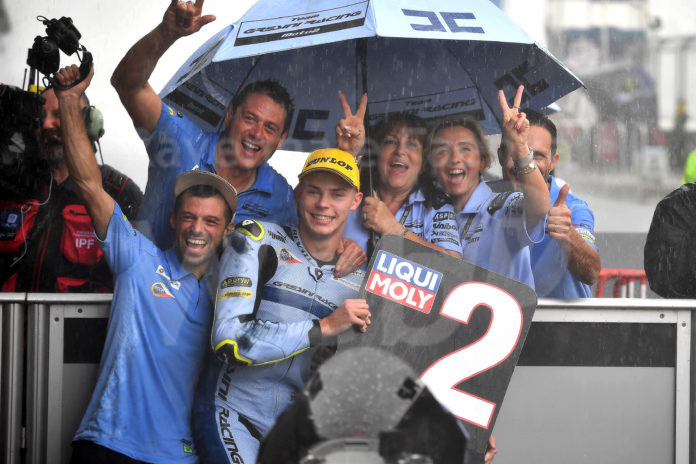 Partenza movimentata quella della Moto2, con gara dichiarata inizialmente asciutta. Poi uno scroscio d’acqua ad abbattersi improvvisamente sulla griglia di partenza: vengono dati 5 minuti in più per permettere alle squadre di poter cambiare le gomme e partire con un set-up da bagnato. Super rimonta per Filip Salač che si mette al comando della gara, quando a 8 giri dalla fine, dopo aver commesso un piccolo errore che gli fa perdere una posizione, viene esposta la bandiera rossa per le condizioni meteo estreme. Non avendo completato i 2/3 di gara, viene programmata la ripartenza per una sprint race di 5 giri, ma nel sighting lap viene esposta nuovamente la bandiera rossa per le condizioni proibitive della pista. Viene di conseguenza decretata la classifica finale della gara che vede Filip Salač nel secondo gradino più alto del podio, dove ad applaudirlo c’è tutta la Gresini Family, con Nadia emozionata per questo primo podio 2022 della Gresini Racing Moto2.