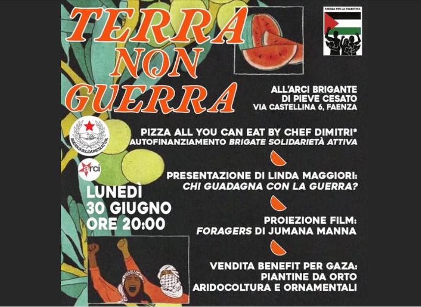 Lunedì 30 giugno all’Arci Brigante di Pieve Cesato, via Castellina 6, il coordinamento Faenza per la Palestina, nato dopo la manifestazione del 31 maggio scorso, insieme ad Arci e Brigate di Solidarietà organizza una serata di solidarietà e approfondimento.