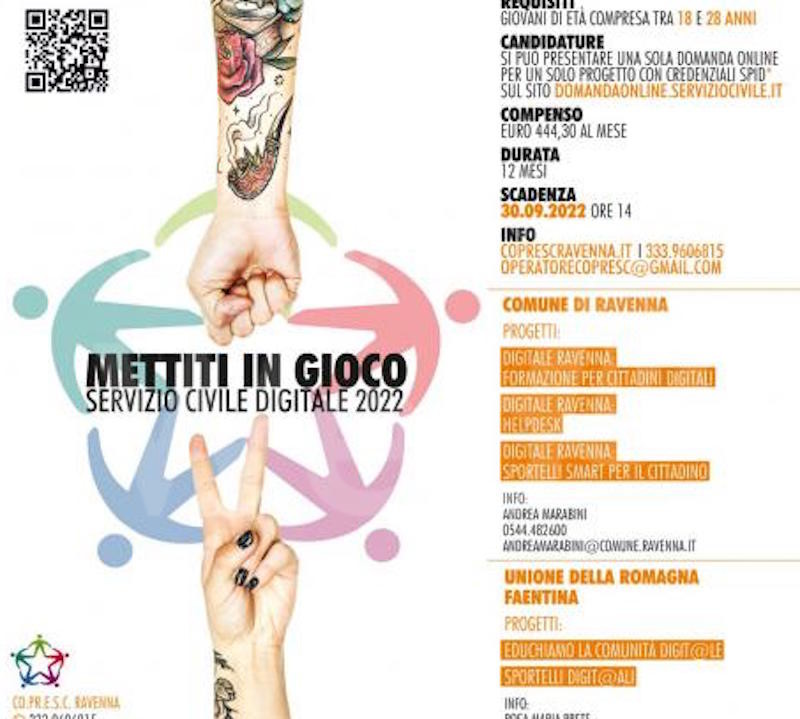 Per maggiori informazioni è possibile consultare il bando al seguente link: https://www.politichegiovanili.gov.it/comunicazione/news/2022/8/bando_sca_scd/ oppure sul sito del Comune di Ravenna https://www.comune.ra.it/bandi/servizio-civile-universale-digitale/