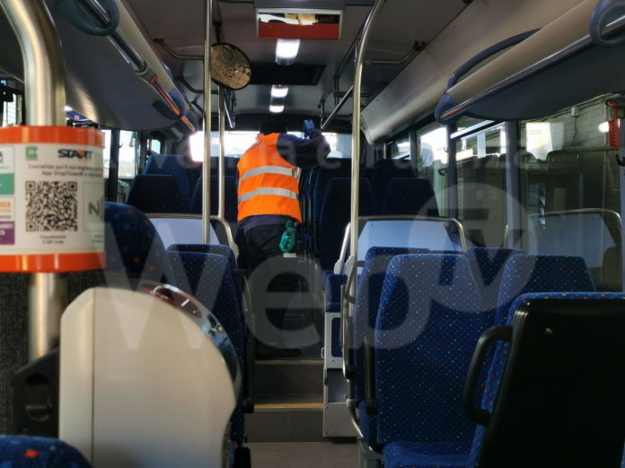 Prosegue l’attività di sanificazione giornaliera dei bus, che ogni giorno vengono dotati di un bollino di colore diverso per certificare l’intervento. La procedura prevede, inoltre, la sanificazione immediata e specifica mediante nebulizzazione al perox, perossido di idrogeno, qualora sui bus, in particolare gli scuolabus, sia stata accertata la presenza di una persona positiva.