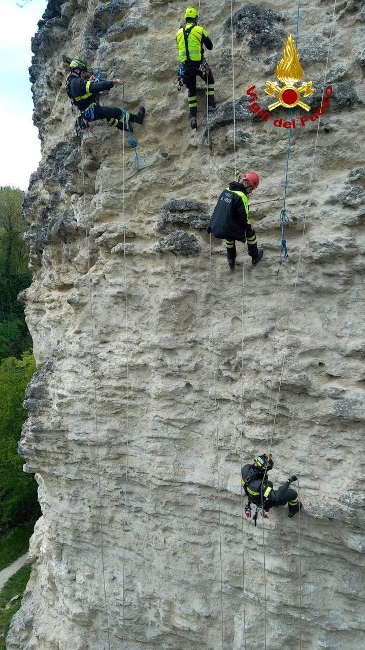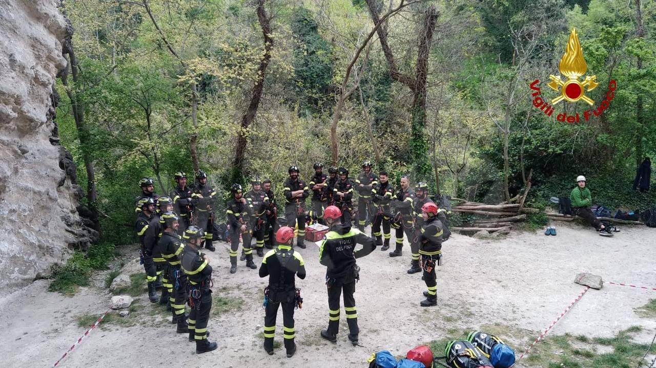 Diciotto vigili del fuoco sono impegnati in manovre di soccorso su corda, derivanti da tecniche alpinistiche e speleologiche standardizzate a livello nazionale.