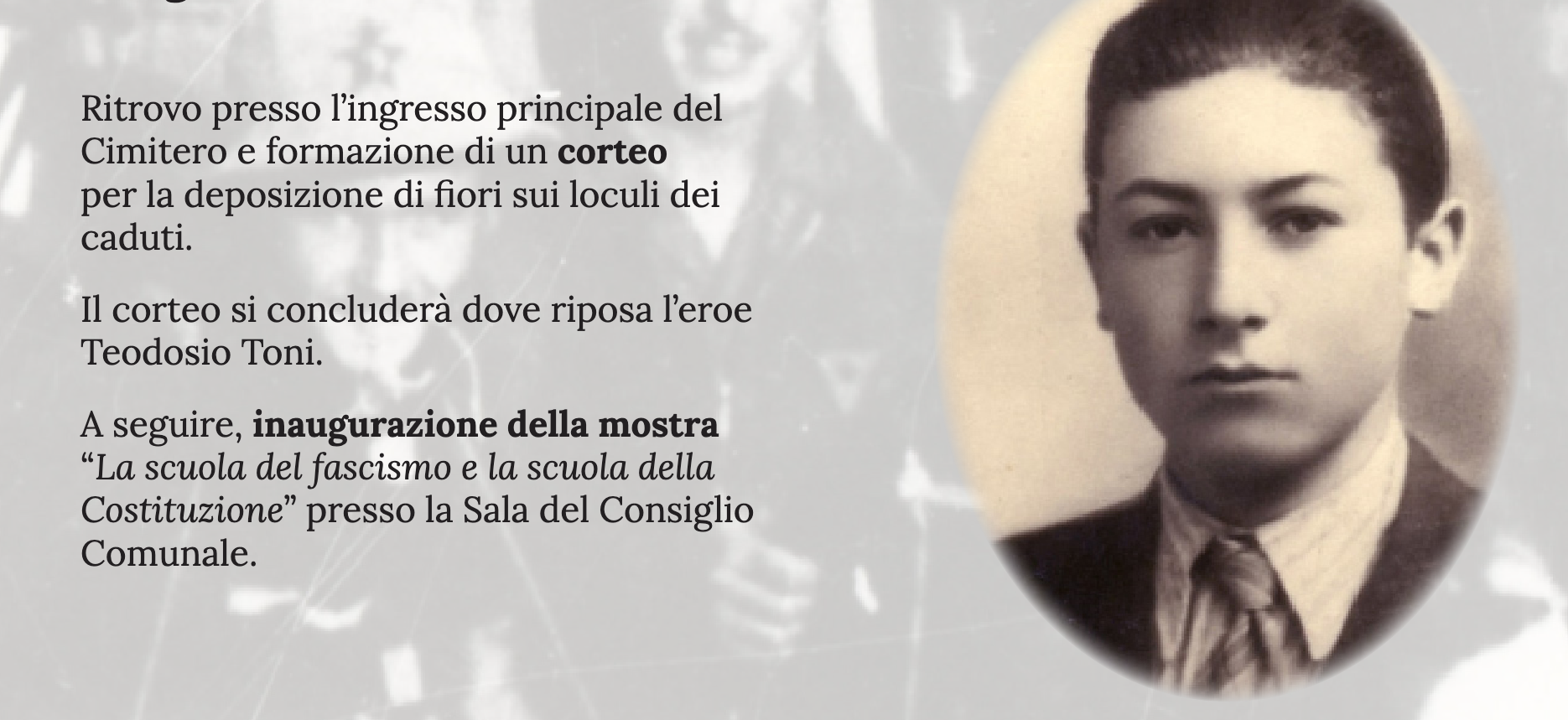 Domenica 19 ottobre 2025, alle ore 11 presso il Cimitero della Madonna della Salute si terrà la celebrazione dell’81° Anniversario del martirio del partigiano solarolese Teodosio Toni. Il programma della celebrazione prevede il ritrovo presso l’ingresso principale del Cimitero e la formazione di un corteo per la deposizione di fiori sui loculi dei caduti. Il corteo si concluderà dove riposa l’eroe Teodosio Toni.