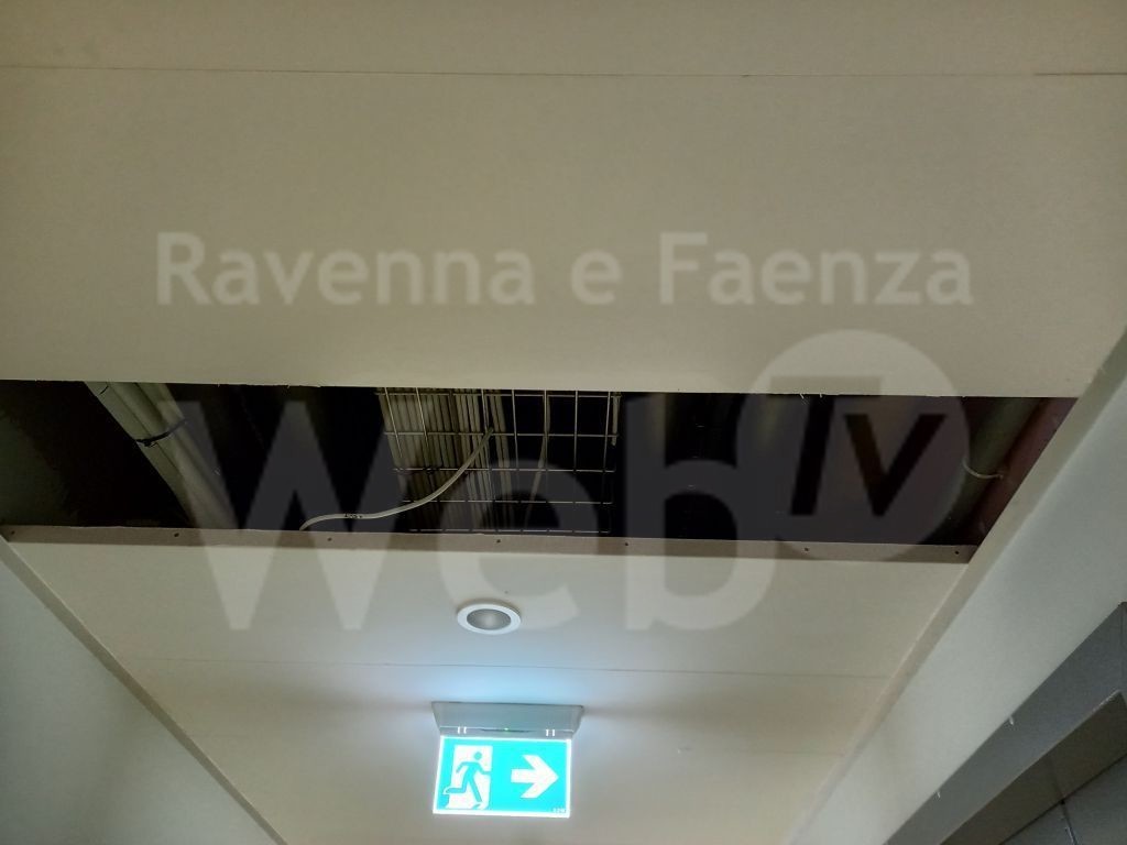 Negli uffici del primo piano, a febbraio, il controsoffitto, composto di pesanti doghe metalliche rettangolari, ha ceduto, facendone cadere una a terra, anch’essa senza colpire nessuno. Tuttora non rimossa, ha lasciato in alto un’ampia apertura.