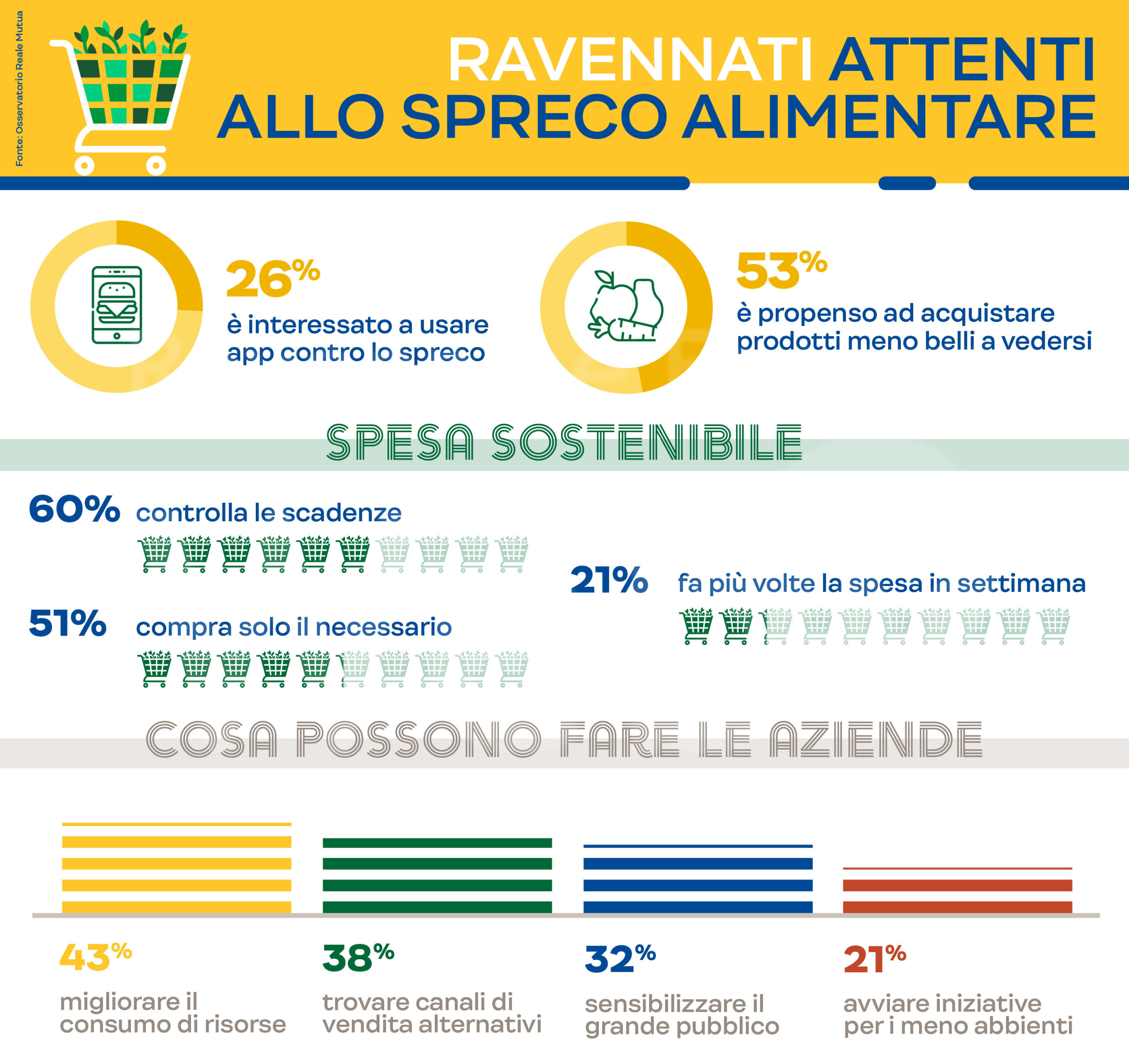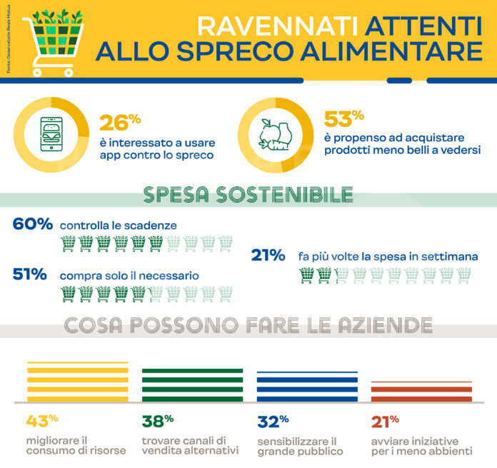 Ma l’attenzione alla sostenibilità è una “richiesta” che i consumatori fanno alle stesse aziende, tanto che quasi uno su due (45%) tende a premiare nei suoi acquisti quelle che si mostrano più sensibili. Perché oggi le imprese, confermano gli abitanti di Ravenna, hanno una grande responsabilità verso l’ecosistema ambientale e sociale. Ma in che modo possono fare la propria parte? Il 43% ritiene che sia importante che i produttori ottimizzino l’uso di risorse energetiche e idriche mentre per il 38% le aziende potrebbero trovare canali di vendita dedicati per i prodotti imperfetti per ridurre gli sprechi mentre. Il 32% vede nelle campagne di sensibilizzazione rivolte al grande pubblico l’attività più importante e un ulteriore 21% pensa a iniziative che coinvolgano produttori e associazioni a sostegno dei meno abbienti, coniugando così la lotta allo spreco all’aiuto dei più deboli.