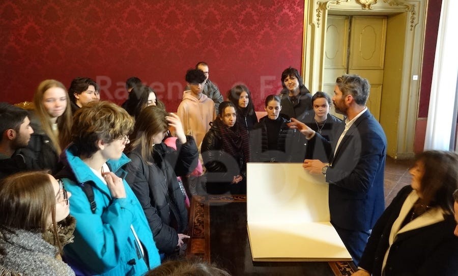 Nell’ambito degli scambi didattici e culturali tra istituti superiori europei, nel pomeriggio di oggi, martedì 14 febbraio, accompagnati dai rispettivi docenti, 12 studenti del Liceo di Macon, cittadina nella regione Borgogna, e 9 del Liceo Torricelli-Ballardini, tutti impegnati nel percorso per l’ottenimento del diploma ESABAC, hanno visitato Palazzo Manfredi e le sue sale.