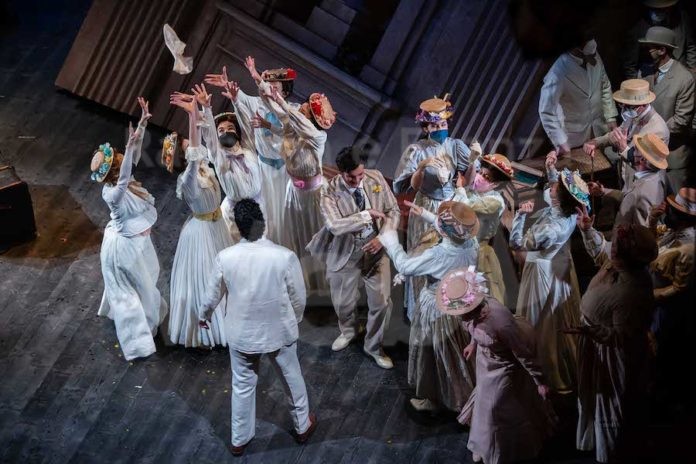 “Abbiamo creato un allestimento – spiega Aldo Tarabella circa la collaborazione con lo scenografo Giuliano Spinelli – che è divenuto un unico elemento poetico che potesse dialogare con la storia di Manon: un palazzo monumentale che, al pari dei sogni e delle ambizioni della protagonista dell’opera, subirà crolli e mutazioni, dal giocoso esterno del palazzo di posta del primo atto agli interni maestosi del salone di Geronte al desolante molo del porto, sino alla sua definitiva metamorfosi nell’ultimo atto. Ho pensato che questa storia potesse sopravvivere oltre il tempo, come se fosse stata incisa sulle mura del palazzo per poi essere raccontata in un altro tempo, agli inizi del Novecento, rendendola così ancor più vicina a noi, durante un inizio d’anno a Parigi.”