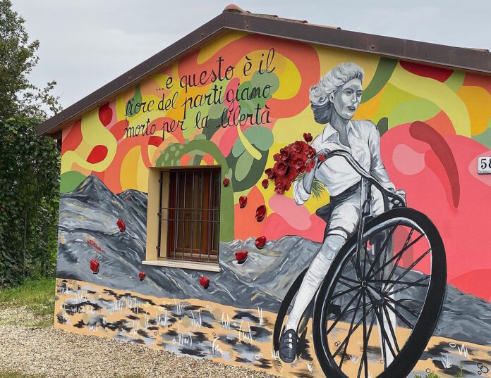 L’opera, frutto di un concorso di idee organizzato dalla Presidenza del Consiglio del Comune di Faenza in collaborazione con il Liceo artistico Torricelli-Ballardini, è stata realizzata dagli studenti della 5BA sotto la guida della professoressa Laura Dalmonte. Un’immagine potente, quella di una giovane staffetta in bicicletta, che si staglia sullo sfondo delle colline faentine, accompagnata da una strofa di Bella Ciao.