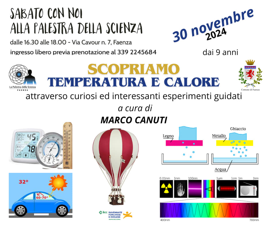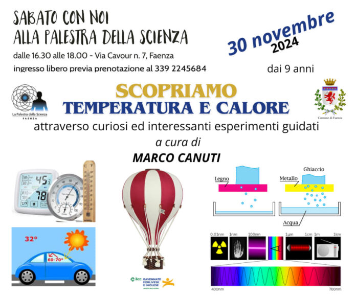 Sabato 30 novembre nell’ambito della rassegna “Sabato con Noi 2024” alla Palestra della Scienza – in via Cavour 7 – si terà l’incontro “Scopriamo temperatura e calore – attraverso curiosi ed interessanti esperimenti guidati”, curato da Marco Canuti.