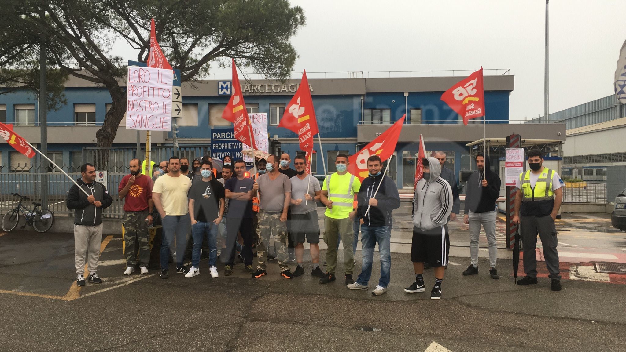 Tutti i lavoratori di Cofari e Logitec del turno di mattina sono rimasti fuori dalla fabbrica, riuniti nel piazzale della Marcegaglia.