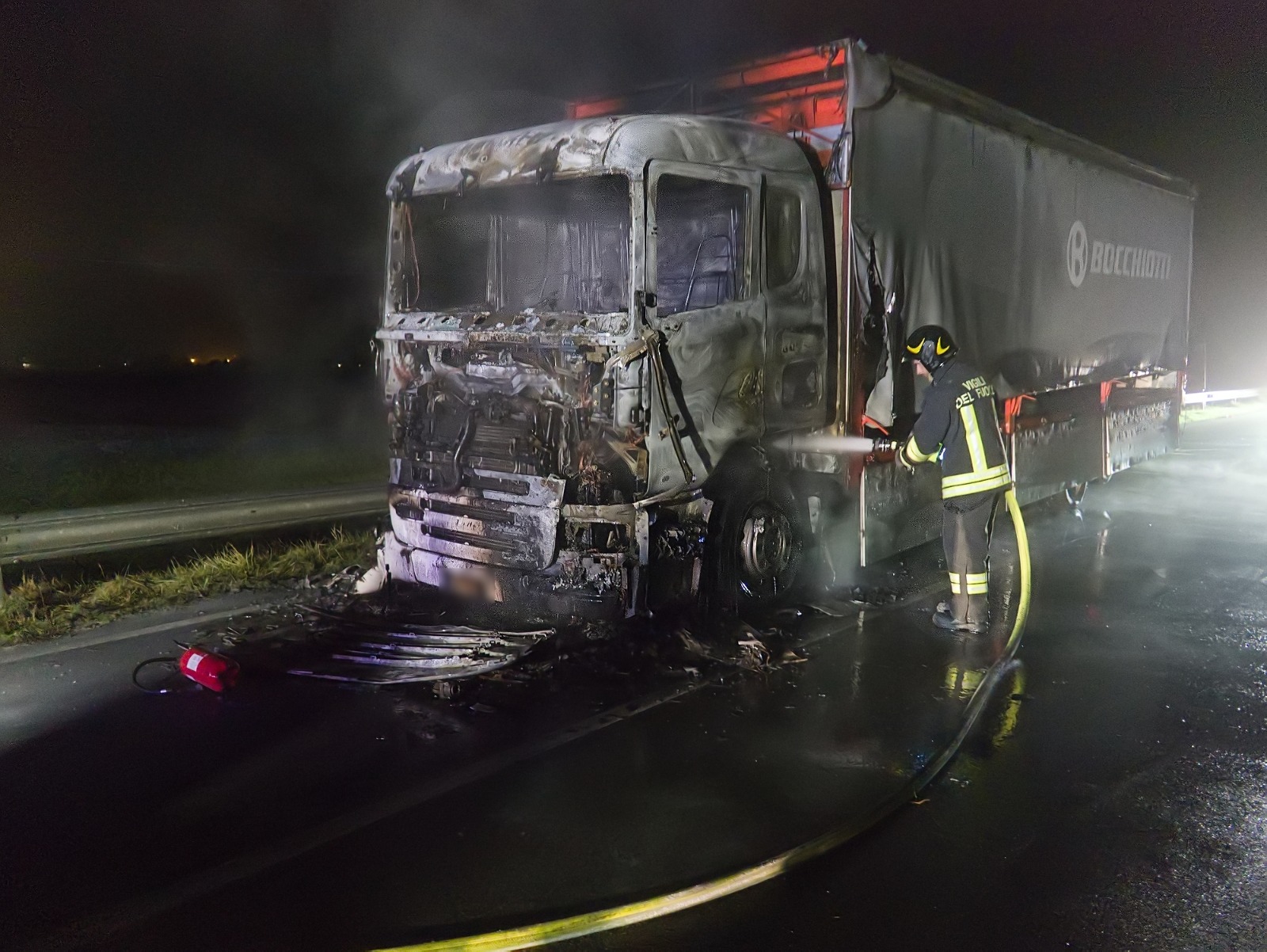 Secondo una prima ricostruzione, il mezzo pesante ha improvvisamente iniziato a bruciare durante la marcia. L’autista è riuscito ad accorgersi subito dell’anomalia, fermare il veicolo e scendere in sicurezza, lanciando l’allarme ai Vigili del Fuoco.