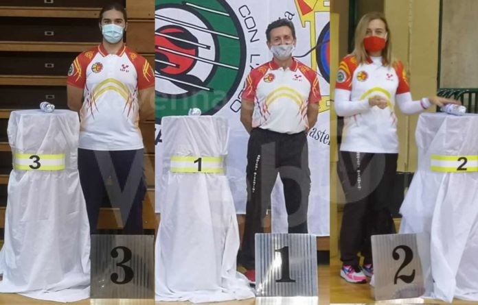 Particolare il podio che i bizantini hanno trovato: tre basamenti rialzati (ricoperti di stoffa) dove, un organizzatore dotato di guanti, è passato a lasciare il singolo premio che l’atleta, in tutta sicurezza, ha potuto ritirare dopo la chiamata senza dover entrare in contatto con nessuno. Un modo ingegnoso per aumentare l’efficacia dei già rigidi protocolli di sicurezza messi in essere dalla federazione Fitarco, per tutelare i propri atleti ed i componenti delle società organizzatrici degli eventi.