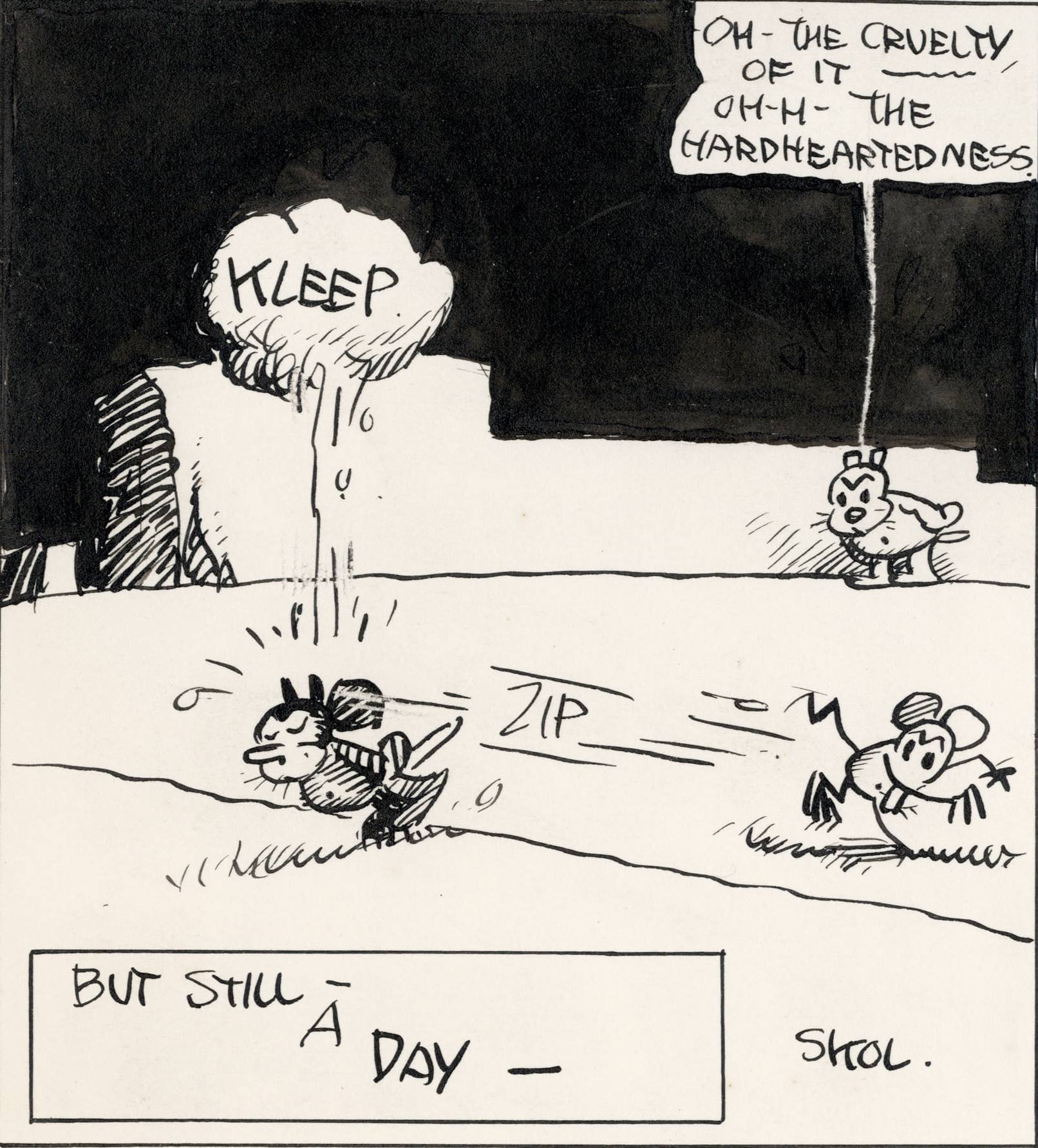 Krazy il gatto (o la gatta?) adora il topo Ignatz, spasima per lui, vive nell’attesa di un suo gesto d’affetto. Ignatz invece detesta Krazy, lo maltratta e invariabilmente, appena può, lo colpisce lanciandogli un mattone. Su questa storia semplice di amore non corrisposto, ma senza sosta sognato e desiderato, si fonda una delle strisce che stanno alla base della storia del fumetto: Krazy Kat di George Herriman, pubblicata dal 1913 al 1944 sui più importanti quotidiani americani. Con il suo mix di umorismo surreale e poesia Krazy Kat ha conquistato fan illustri, da Pablo Picasso a Umberto Eco, da Charles Schulz a Art Spiegelman. La mostra a Ravenna è un’occasione unica per ammirare da vicino una ventina delle rarissime tavole originali di Herriman, un maestro del segno, del linguaggio e della composizione che ha ispirato tanti autori. Krazy Kat è una strip capolavoro che, secondo Chris Ware, rappresenta al tempo stesso “un ritratto dell’America, un autoritratto di Herriman, e il primo tentativo di riprodurre l’intera coscienza umana in una striscia a fumetti”.