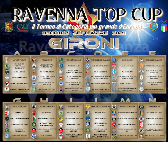 Dall’8 al 12 settembre andrà in scena la Ravenna Top Cup, importante torneo di calcio organizzato da Futuri Campioni. L’evento, che gode del patrocinio del Comune di Ravenna, della Regione Emilia-Romagna ed è riconosciuto dalla FIGC, vedrà la partecipazione di 72 società molte delle quali partecipanti al nostro campionato di serie A, diversi club stranieri e numerose Scuole Calcio Dilettantistiche sparse per lo stivale. Saranno presenti con le loro formazioni giovanili Juventus, Verona, Sampdoria, Atalanta, Fiorentina, Torino, Genoa, Udinese, Sassuolo, Parma, Spezia, Venezia, Empoli, Frosinone, Monza, Venezia, Bordeaux.