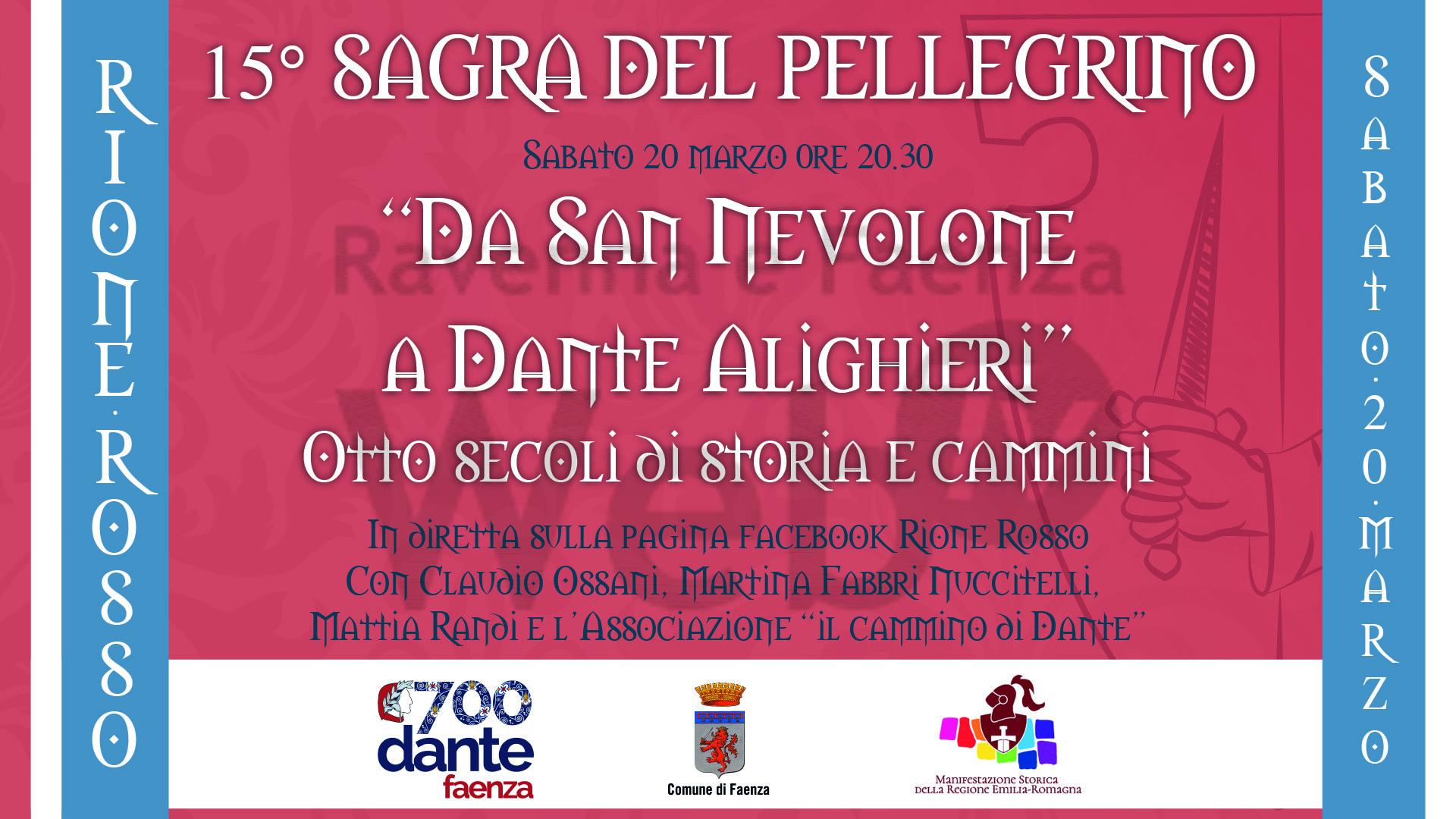 Sabato 20 Marzo quindi, dalle ore 20,30 sulla pagina Facebook del Rione Rosso grazie alla collaborazione del nuovo gruppo comunicazione rionale, si terrà un evento in modalità web intitolato: Da San Nevolone a Dante Alighieri, otto secoli di storia e di cammini. L’appuntamento, moderato dal giornalista Claudio Ossani e dalla medievalista Martina Fabbri Nuccitelli, entrambi rionali, con la partecipazione dello storico Mattia Randi, autore di numerose pubblicazioni, vedrà inoltre la gentile partecipazione di esponenti dell’associazione Il Cammino di Dante, nata nel 2012 grazie alla passione condivisa per Dante Alighieri, tra amanti del trekking e studiosi della Divina Commedia con l’obiettivo di fare conoscere il panorama naturalistico, storico e culturale del viaggio di Dante per restituire lustro al patrimonio paesaggistico locale, trasmettendo emozioni e offrendo nuove memorie per tali luoghi a volte dimenticati o nascosti.