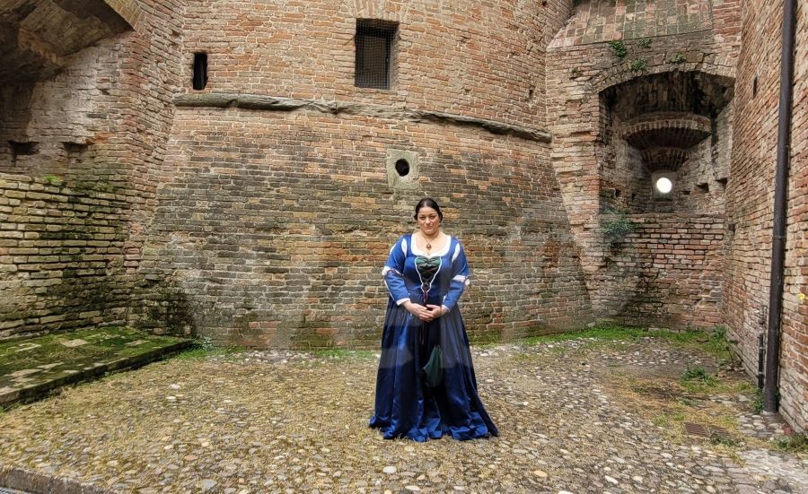 Caterina ha 14 anni quando il primo maggio del 1477 fa tappa ad Imola durante il viaggio da Milano a Roma che la porterà a incontrare il suo sposo Girolamo Riario. Un’accoglienza festosa e con grandi onori viene fatta dalla città al corteo nuziale e alla giovanissima sposta che per la prima volta vede Imola e la sua possente rocca. La visita alla fortezza sarà l’occasione per ripercorrere questo momento fondamentale della vita di Caterina che segna il passaggio dall’innocenza fanciullesca alla maturità e alla consapevolezza del ruolo di Signora di Imola e Forlì.