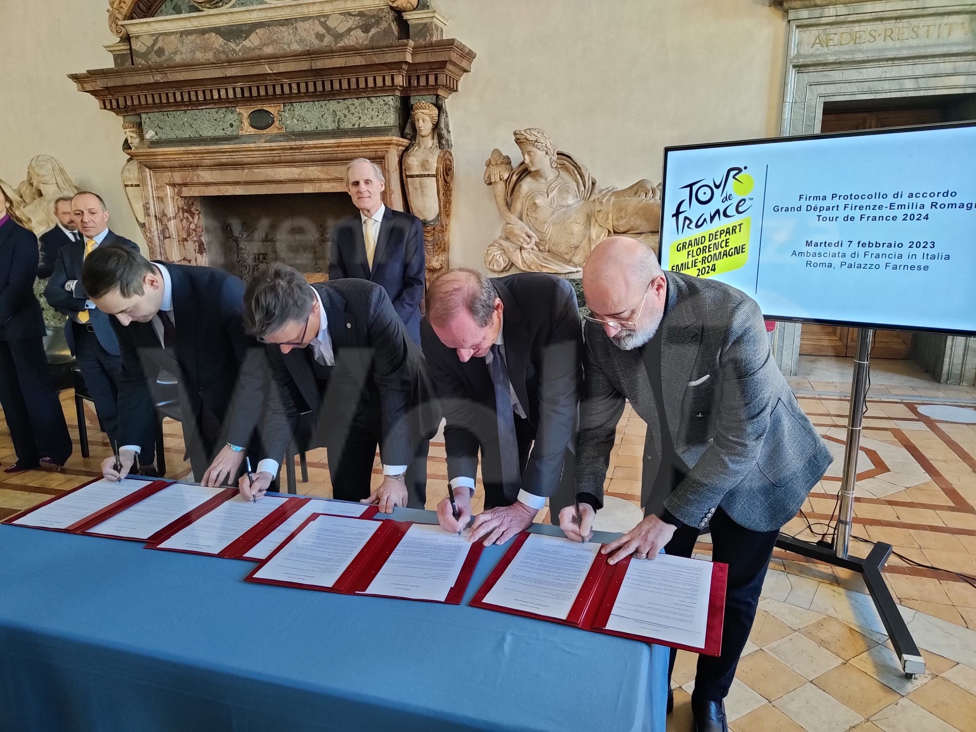 Questa mattina a Roma appuntamento importante all’Ambasciata di Francia in Italia, a Piazza Farnese, dove è stato firmato il Protocollo d’accordo per l’organizzazione del Grand Départ Florence Émilie-Romagne 2024, la Grande Partenza fissata il 29 giugno 2024, e il passaggio dal Piemonte il 1^ luglio prima dell’approdo in Francia, dopo le tre tappe italiane.