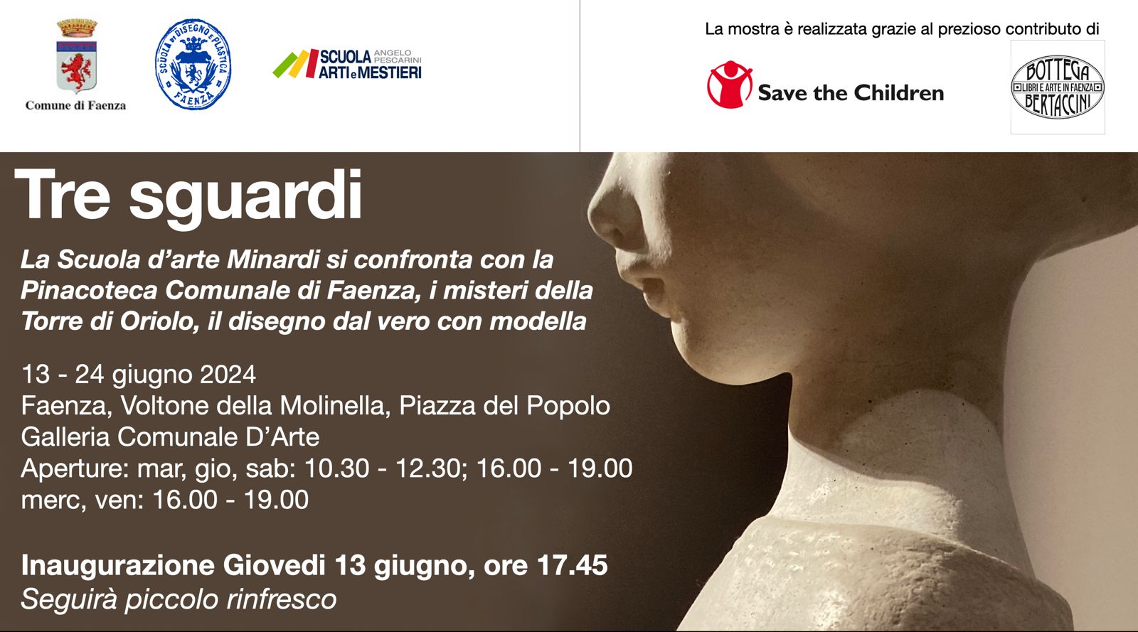 La scuola Minardi, fondata a Faenza nel 1797, oggi conta oltre 120 allievi, tra cui molti bambini e adolescenti. “Tre sguardi” rappresenta un’occasione per celebrare l’arte e il talento degli allievi e per sottolineare l’importanza della formazione artistica come strumento di crescita personale e culturale.