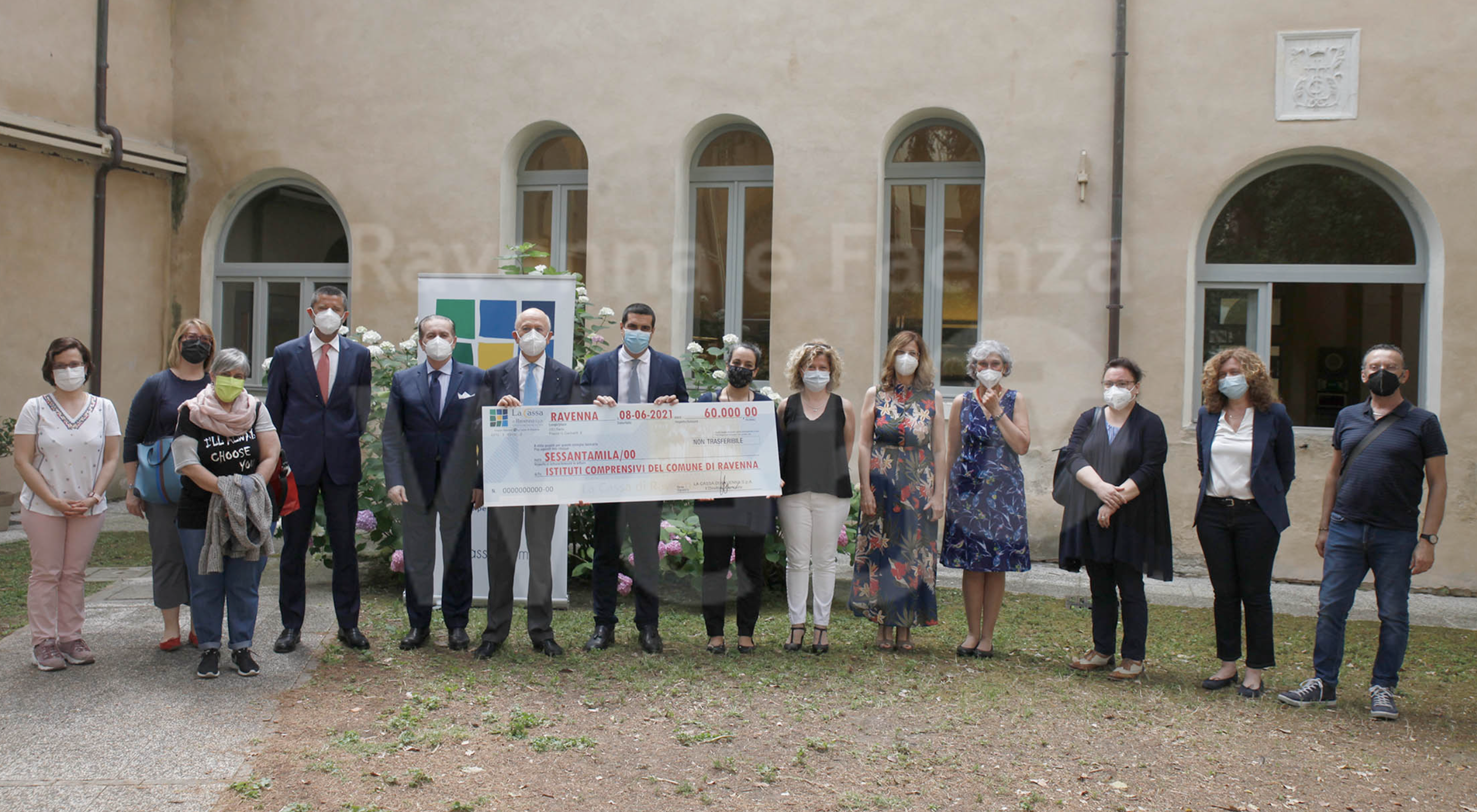 Il Presidente del Gruppo Cassa di Ravenna, Antonio Patuelli ed il Direttore Generale, Nicola Sbrizzi, hanno consegnato oggi ai Dirigenti scolastici degli Istituti Comprensivi del Comune di Ravenna, alla presenza del Sindaco Michele De Pascale, in rappresentanza del Comune di Ravenna, l’assegno di € 60.000,00, ripartito in base al numero degli alunni dei singoli Istituti, frutto della sottoscrizione del prestito obbligazionario con finalità sociali (Social Bond), promosso dalla Cassa, che ha consentito alla clientela di effettuare un buon investimento e contestualmente destinare una liberalità, totalmente a carico della Cassa, a favore delle Scuole Elementari e Medie appartenenti agli Istituti Comprensivi del Comune di Ravenna per le loro iniziative di sviluppo educativo, didattico e tecnologico.
