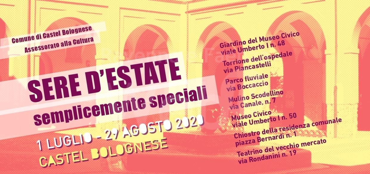 Un calendario ricco di appuntamenti a Castel Bolognese nei mesi di luglio e agosto 2020, nell’ambito del più ampio calendario Estate in collina dell’Unione della Romagna Faentina, grazie al contributo della Regione Emilia-Romagna / Emilia-Romagna Cultura d’Europa.; il Comune di Castel Bolognese, con le parole dell’assessore alla cultura Luca Selvatici, comunica: