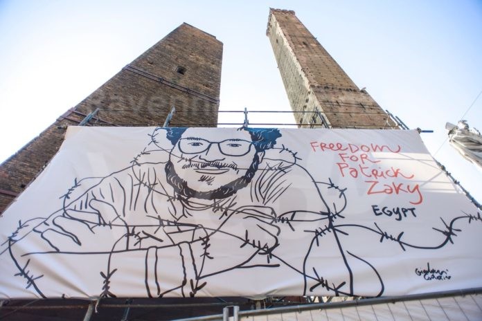 Ancora una volta Bologna chiede libertà per Patrick Zaki e lo fa dal cuore della città: la torre Garisenda. Il cartellone con l’immagine ideata dall’artista ravennate Gianluca Costantini è stato posizionato su un ponteggio allestito nell’ambito del cantiere per i lavori di consolidamento della torre. Ieri il tribunale egiziano ha stabilito una nuova proroga di 45 giorni della detenzione cautelare per lo studente iscritto all’Alma Mater Studiorum – Università di Bologna, arrestato a Il Cairo lo scorso 7 febbraio e ancora in stato di detenzione preventiva.