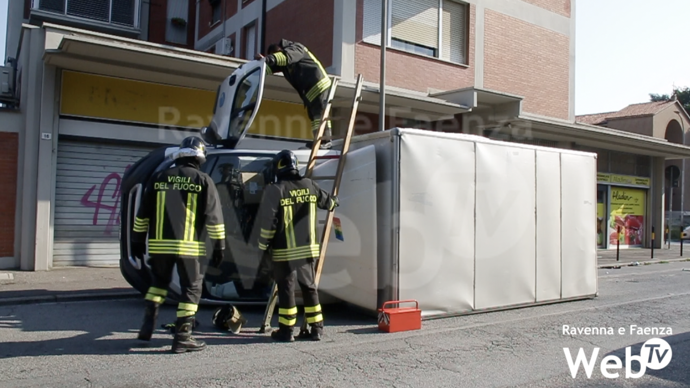 Un furgone Peugeot bianco si è ribaltato sul fianco dal lato conducente in seguito allo scontro con un’auto Fiat Multipla grigio chiaro: è successo in via Narsete, nei pressi dell’incrocio con via Atalarico, intorno alle 8,30 di questa mattina. Alla guida del furgone vi era un ragazzo, che nel momento dell’impatto è poi andato avanti pochi metri, mentre la Multipla ha compiuto una rotazione su se stessa. Come se non bastasse, anche un altro mezzo, un furgone Fiat Doblò, è stato colpito e coinvolto nell’incidente: quest’ultimo veicolo si trovava parcheggiato a bordo strada.