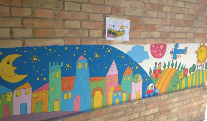 La coordinatrice della scuola dell’infanzia e del doposcuola “Mons. G. Morelli”, Cinzia Arrigoni, ha di nuovo accolto la proposta degli operatori culturali di abbellire una parete del cortile con un’opera di grande impatto cromatico.