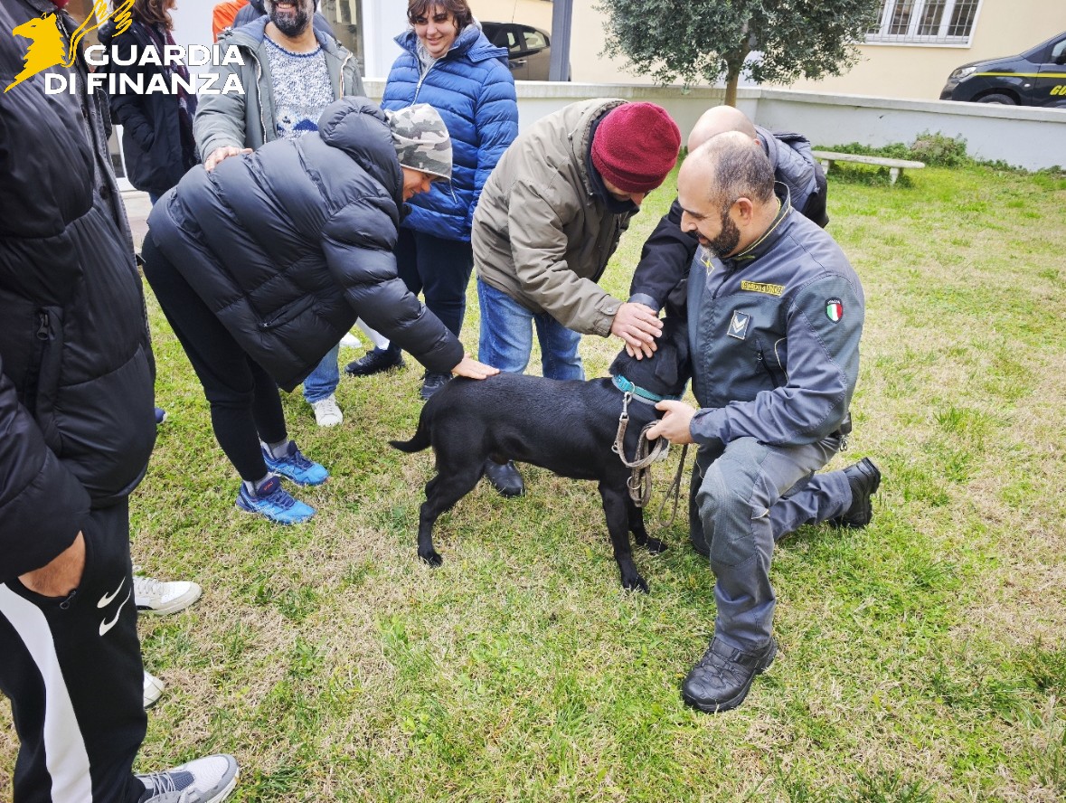 Accompagnati dai loro educatori, i giovani hanno assistito a una dimostrazione pratica delle tecniche utilizzate dai cani antidroga Bekam e Malik, impegnati in una serie di simulazioni di ricerca di materiale stupefacente. I finanzieri hanno illustrato le fasi dell’addestramento, spiegando come il lavoro con i cani si fondi sul gioco, sulla fiducia e sul forte legame con il conduttore.