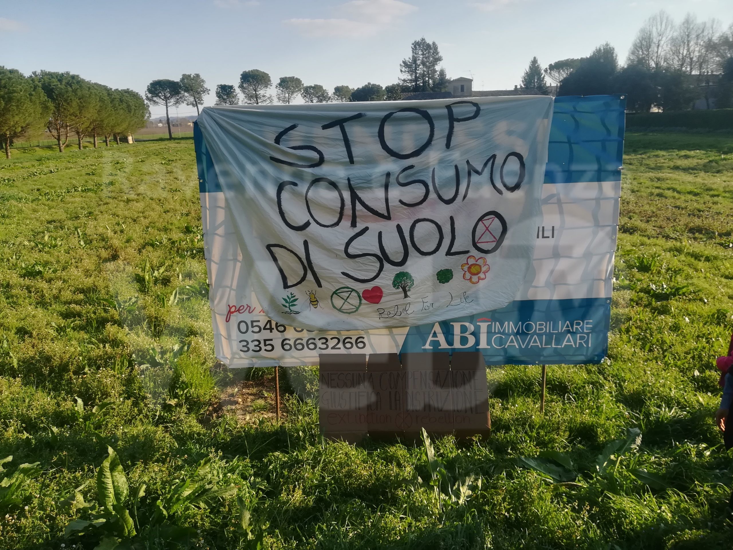 Ieri attivisti di Extinction Rebellion Faenza hanno attaccato uno striscione con scritto STOP CONSUMO DI SUOLO sopra al cartellone pubblicitario “Vendesi villette” davanti Villa Ghilana.