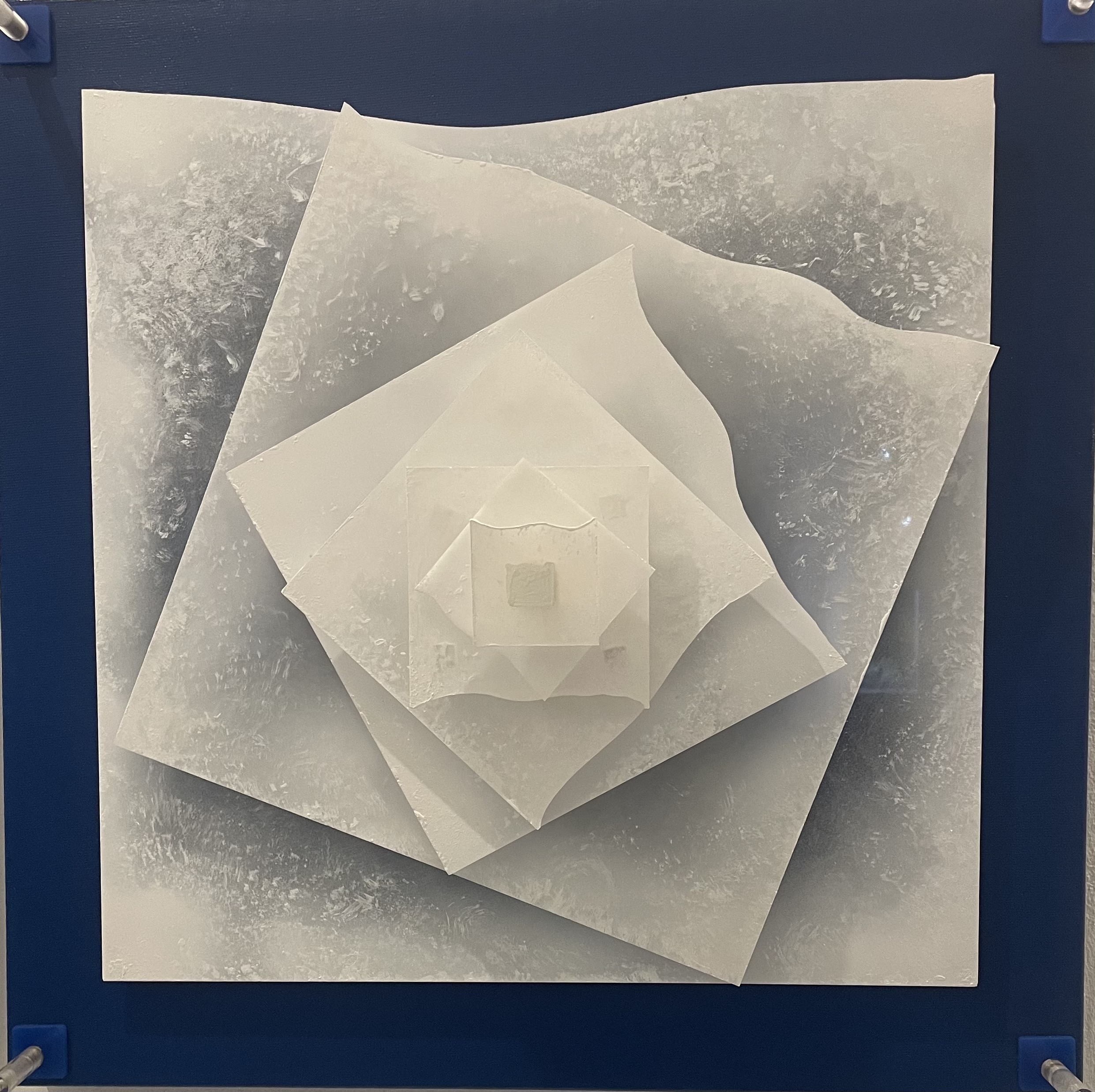 Nel suo lavoro, l’artista ha realizzato una serie di opere costruite e strutturate con tele e plexiglass, con dimensioni quadrate che variano dai 40×40 ai 50×50 centimetri. Utilizza materiali eterogenei con la sensibilità cromatica e scultorea del mosaicista, usando tessere di diverse nature che dipinge e ricolloca in strutture dinamiche e multiformi.