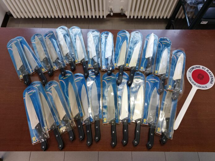 La Polizia Locale di Ravenna – Ufficio Polizia Commerciale e Tutela del Consumatore- durante controlli, al mercato settimanale di Piazza Sighinolfi, ha accertato che un ambulante con regolare licenza per la vendita di abbigliamento, poneva in vendita in aggiunta a numerosi articoli, 24 coltelli da cucina.