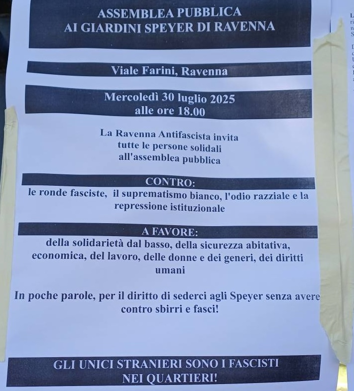 “Oggi nel tardo pomeriggio presso i Giardini Speyer è stata indetta dal sedicente comitato La Ravenna Antifascista , sigla utilizzata per nascondere i nomi degli organizzatori , per manifestare al fine , c’è scritto nel volantino affisso abusivamente in diverse pensiline delle fermate dell’autobus ( in particolare viale Farini, davanti e difronte alla stazione e pure in zona del Canale Candiano):” 𝗽𝗲𝗿 𝗶𝗹 𝗱𝗶𝗿𝗶𝘁𝘁𝗼 𝗱𝗶 𝘀𝗲𝗱𝗲𝗿𝗰𝗶 𝗮𝗴𝗹𝗶 𝗦𝗽𝗲𝘆𝗲𝗿 𝘀𝗲𝗻𝘇𝗮 𝗮𝘃𝗲𝗿𝗲 𝗰𝗼𝗻𝘁𝗿𝗼 𝘀𝗯𝗶𝗿𝗿𝗶 𝗲 𝗳𝗮𝘀𝗰𝗶 “