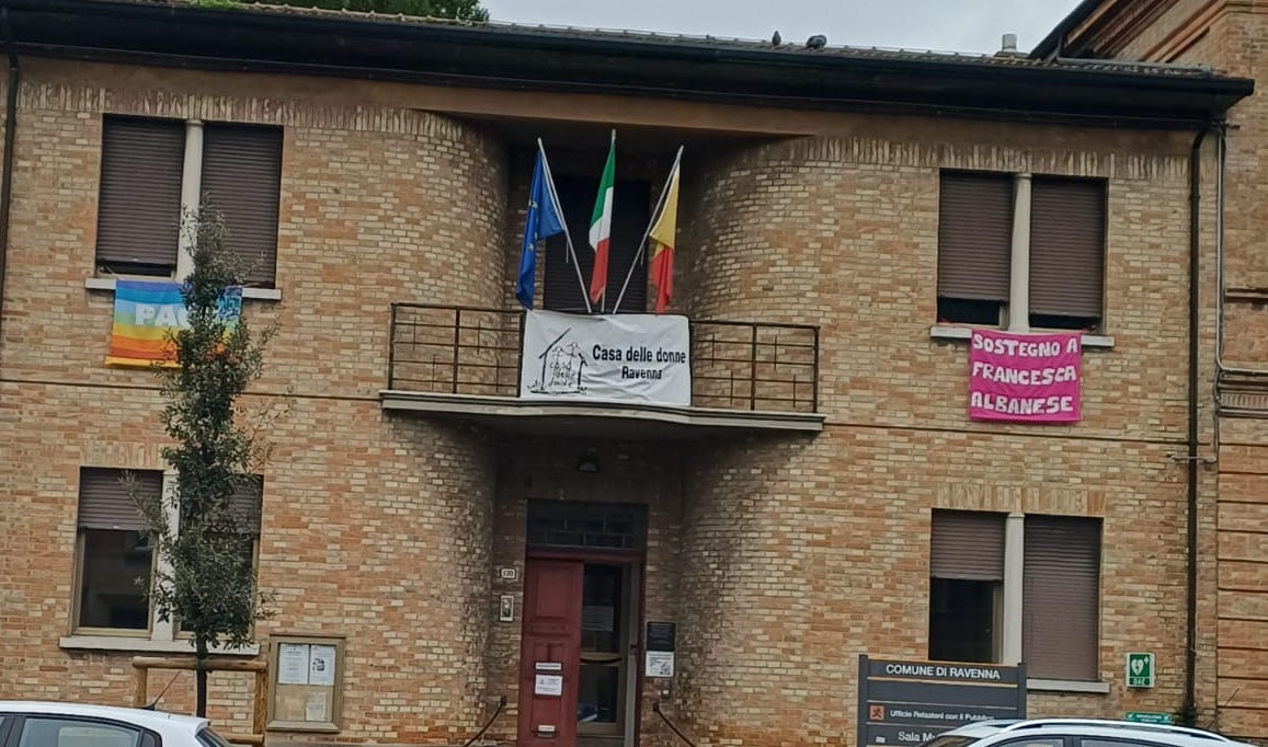 Sulla facciata della Casa delle Donne di Via Maggiore, edificio di proprietà del Comune di Ravenna, oltre alla bandiera arcobaleno già stabilmente ed illegittimamente esposta da mesi, è ora apparso anche uno striscione con la scritta “Sostegno a Francesca Albanese”.