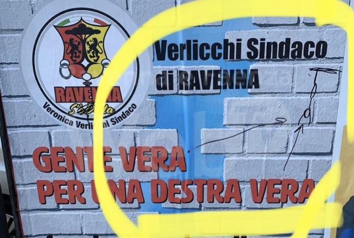 Un manifesto della lista civica Ravenna s’é Desta che contiene la frase “Veronica Verlicchi Sindaco”, affisso in Via Renato Serra é stato oggetto di un’infame sfregio.