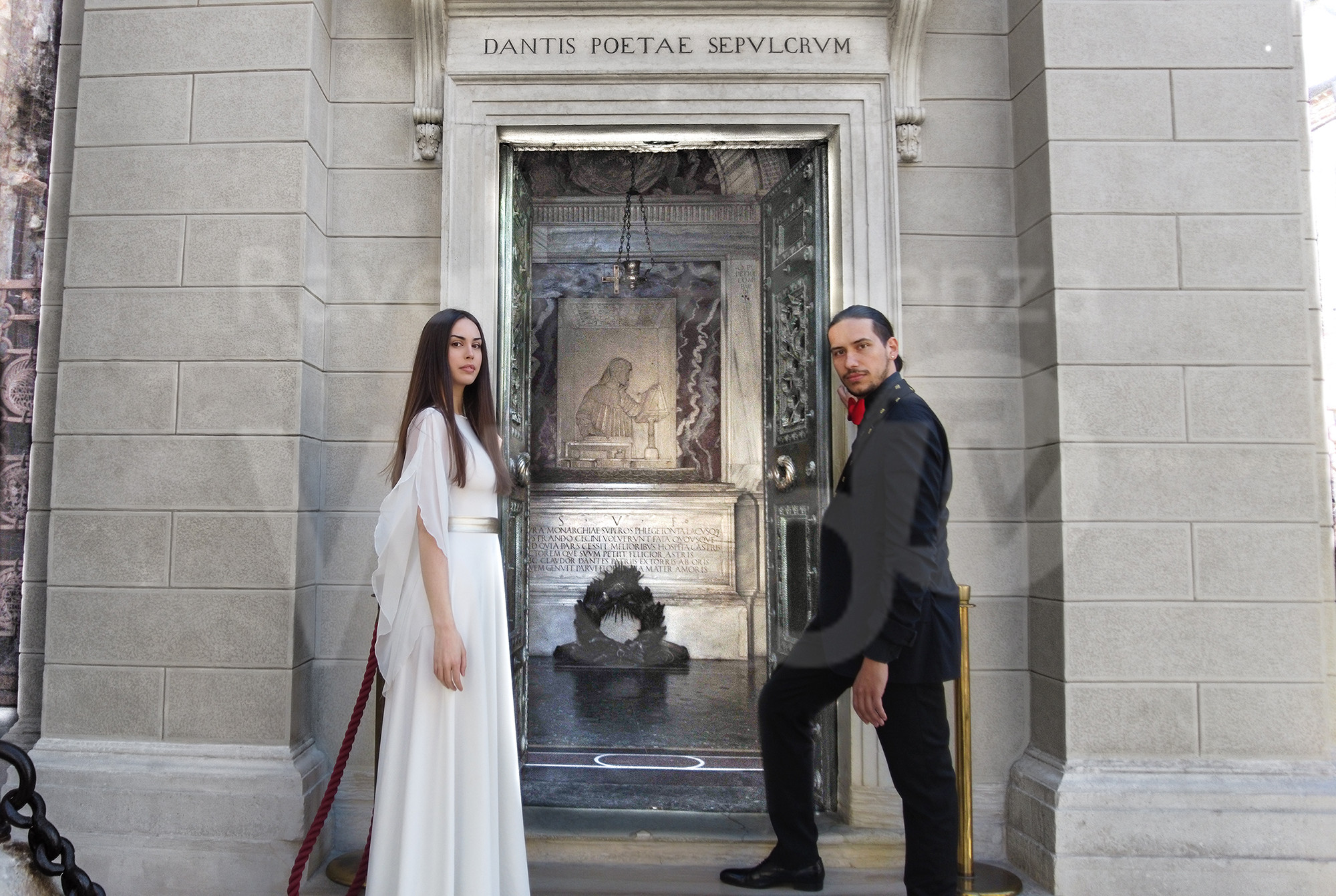 Le riprese di altissima qualità sono state dirette e in gran parte realizzate dai due artisti con dispositivi di ultima generazione che renderanno l’esperienza totalmente immersiva ed innovativa. Inoltre tutti i capi indossati nelle riprese sono stati disegnati e realizzati da Serena Gentilini. In particolare l’abito del Paradiso ispirato alla figura di Beatrice e tutti gli abiti della parte musicale sono legati simbolicamente a livello cromatico ai tre Regni di Dante. All’interno dello spettacolo gli artisti omaggeranno il pubblico svedese con una composizione del DJ svedese Avicii che come pochi sanno fu molto suggestionato dalla Divina Commedia, tanto da venire in Toscana per avvicinarsi alla terra che aveva dato i natali a Dante Alighieri e studiare la Divina Commedia. Esperienza che culminò nella composizione Heaven fortemente ispirata al Paradiso Dantesco. Ma non finisce qui perché nella Biblioteca Classense (una delle più importanti biblioteche italiane) gli artisti mostreranno un pezzo di inestimabile valore proveniente dalla leggendaria collezione dell’editore Leo S. Olschki, la più completa collezione di prime e rare edizioni dedicata all’opera di Dante Alighieri. E proprio da questa collezione si sfoglieranno alcune pagine della preziosissima edizione svedese della Divina Commedia del 1856. Questo oltre a tante altre sorprese. L’importante iniziativa ha il patrocinio del Comune di Ravenna, della Regione Emilia-Romagna, Segretariato Regionale del Ministero dei Beni e delle Attività culturali e del turismo per l’Emilia-Romagna, di SIAE Italia e dell’Associazione SI Svezia-Italia.