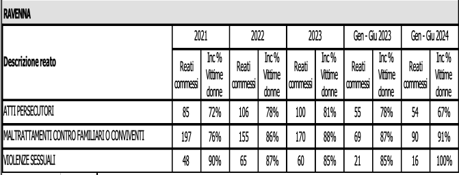 L’insidioso fenomeno si annida spesso all’interno delle mura domestiche, che diventano per molte donne il luogo dove la propria vita, la propria salute e il relativo equilibrio psicologico vengono costantemente minati dai comportamenti vessatori e violenti messi in atto da coloro nei confronti dei quali esse ripongono fiducia e amore: infatti, l’analisi condotta ha evidenziato come nella provincia di Ravenna, gli omicidi volontari consumatesi dal 2022 e sino al primo semestre del 2024, siano 6, di cui 4 perpetrati in ambito familiare e affettivo nei confronti di vittime di sesso femminile.