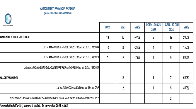 Al riguardo si riportano i dati relativi agli ammonimenti adottati dal Questore di Ravenna ed agli allontanamenti dalla casa familiare disposti in situazioni di significativa emergenza: