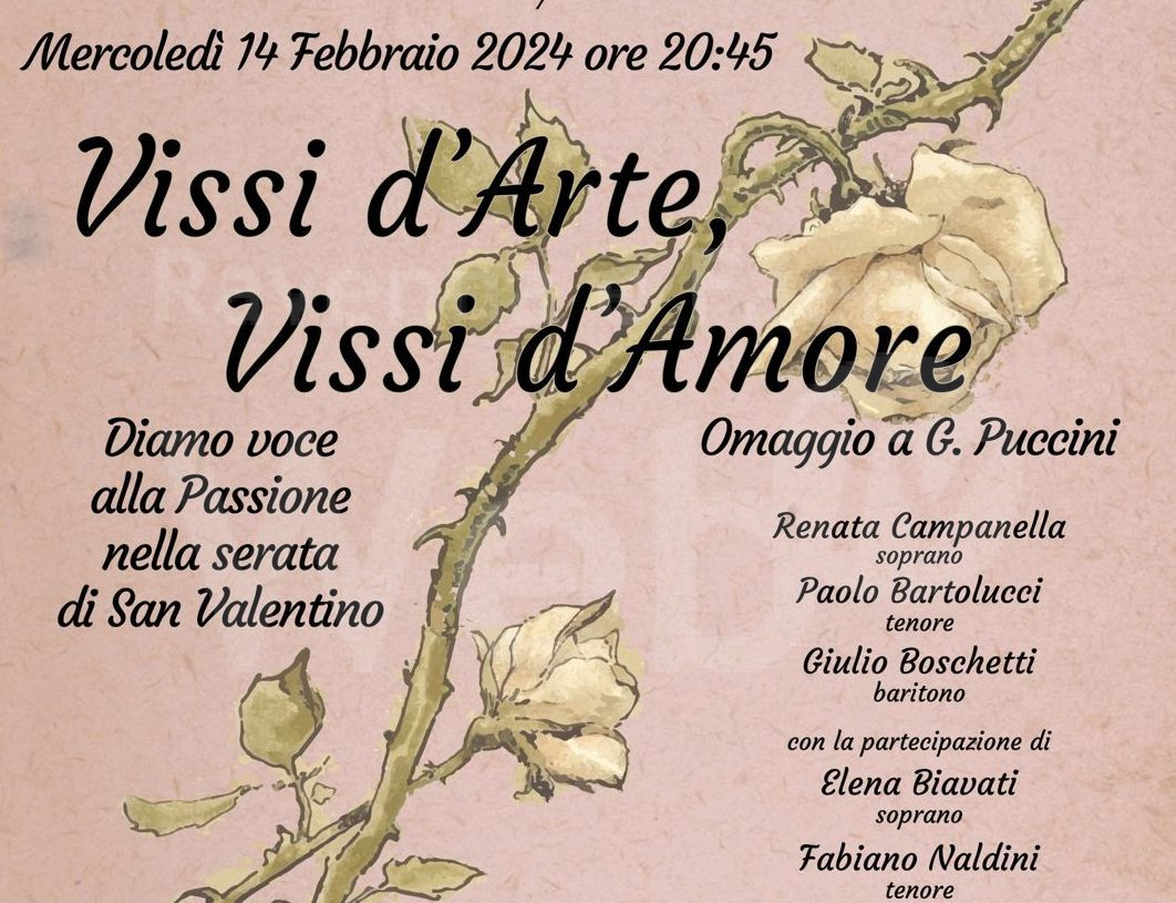 L’Associazione Lirica Manfreda, con il patrocinio del Comune di Faenza, mercoledì 14 febbraio, in occasione di San Valentino, alle ore 20.45, nella cornice del cinema teatro Sarti di Faenza, presenta ‘Vissi d’arte, vissi d’amore’ omaggio a Giacomo Puccini con Renata Campanella (soprano), Paolo Bartolucci (tenore), Giulio Boschetti (baritono) e la partecipazione di Elena Biavati (soprano), Fabio Naldini (tenore), del Coro lirico ‘Città di Faenza’, dell’Ensemble strumentale dell’Associazione Lirica Manfreda e di Monica Ferrini (al pianoforte e lettura testi).