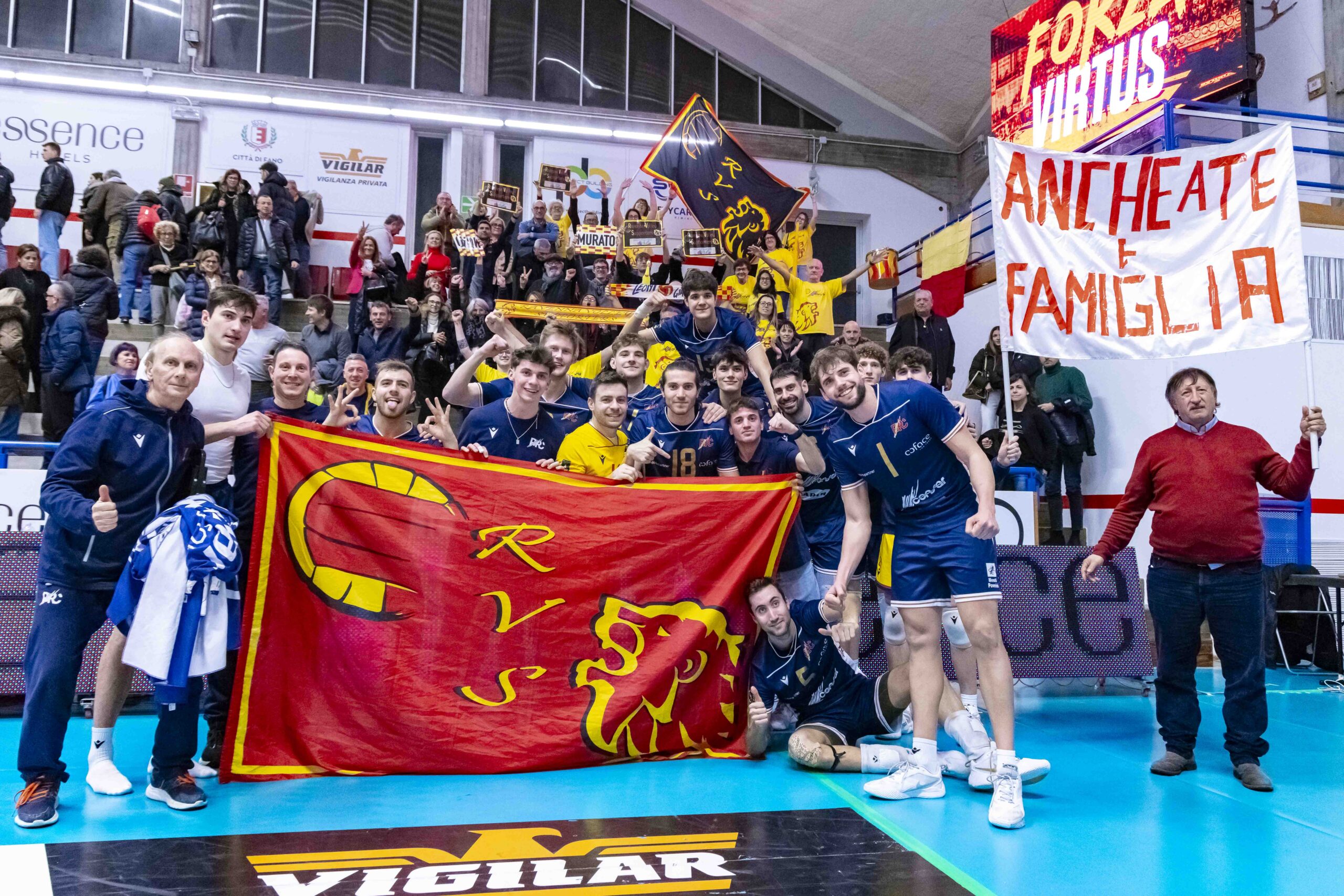 E sull’inerzia del set vinto, la Consar prende decisamente il largo nel quarto set (2-7) con un ace di Copelli e un muro a tre con tocco vincente di Zlatanov, che nella bolgia del Palasport fanese, sembra esaltarsi: prima mette a terra un grande attacco e poi fa saltare la difesa di casa con un ace (4-10). Un altro colpo vincente dai 9 metri, questa volta di Canella, vale il +8 (6-14). Marks prova a rendere meno ampio il divario (13-18). Sembra finita, ma qui la Consar ha il torto di rifiatare un attimo: è quello che aspettava la Smartsystem per rianimarsi e riaccendersi. Spinta dal pubblico, la squadra di Mastrangelo risale la corrente, rosicchia punti su punti, mette pressione a Goi e compagni. Fano si avvicina pericolosamente (19-22), poi con l’ace di Roberti del -1 (22-23) colora i contorni della rimonta che si concretizza con il punto del sorpasso (24-23). Finale bollente ed entusiasmante: Ravenna non concretizza quattro match ball, Fano, che si appoggia solo su Roberti in questi frangenti, si vede annullare tre set ball e sul 31 pari sono Compagnoni e un muro di Klobucar a dare il 2-2 a Fano.