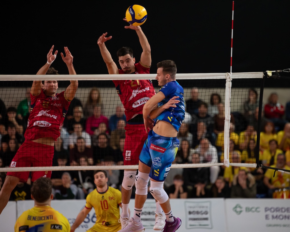 Dopo otto vittorie di fila si ferma la marcia della Consar. A firmare l’impresa, nella bolgia del PalaPrata, è la Tinet che nel big match dell’11esima giornata sfoggia una prestazione pressochè perfetta, aggressiva al servizio (ben 10 gli ace totali), efficace e continua in attacco (52% il suo totale) e con pochi errori, andandosi a prendere con il successo anche il primo posto in classifica. Le difficoltà incontrate dalla formazione di Valentini, che chiude con un solo ace e appena tre muri vincenti, sono sintetizzate dall’esito del secondo set, in cui Prata ha marcato la sua superiorità. Per Goi e compagni arriva però già il momento del riscatto. Venerdì 26, nell’anticipo della 12esima giornata al Pala De Andrè salirà Fano.