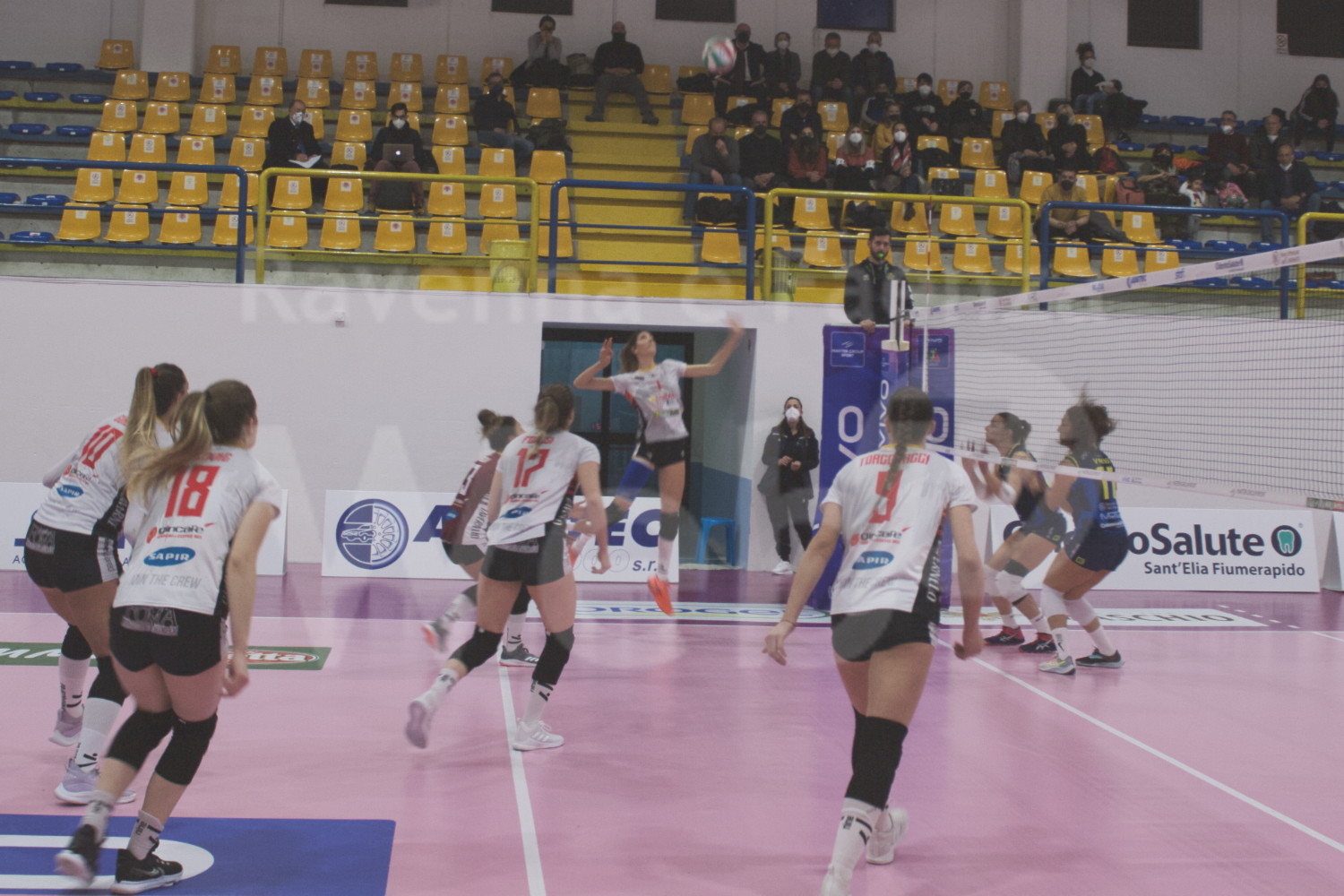Ravenna riparte nel secondo come aveva chiuso il primo parziale e con il turno al servizio di Torcolacci si porta subito sullo 0-5. L’ace di Foresi ribadisce il vantaggio sul 2-7 e le ospiti allungano fino al 5-11. Sant’Elia prova la reazione che vale il -4 sul 10-14, ma le Leonesse fermano sul nascere le ambizioni di rimonta avversarie riportandosi avanti 10-17. Il muro di Guasti (11-19) e l’ace di Bulovic (12-21) mettono in ghiaccio il set, con le padrone di casa che riescono a tornare a -6 sul 17-23, ma devono cedere al primo set point con il muro di Salvatori che mette a terra il 17-25.