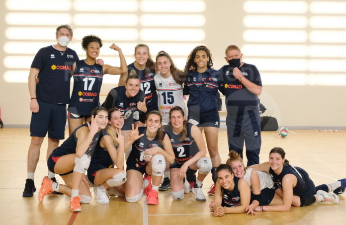 Un’altra bella prestazione per le baby Leonesse, che nei primi due set non lasciano spazio alle avversarie vincendo nettamente i parziali, dominati fin dai primi punti. Dopo aver subito la reazione di Bologna nel terzo, dove le ospiti partono forte e poi contengono la rimonta, le padrone di casa ritrovano il controllo della gara nel quarto: avvio nuovamente favorevole alle ospiti, con la Conad che rovescia il parziale nella fase centrale del set, andando poi a chiudere abbastanza agevolmente la partita.