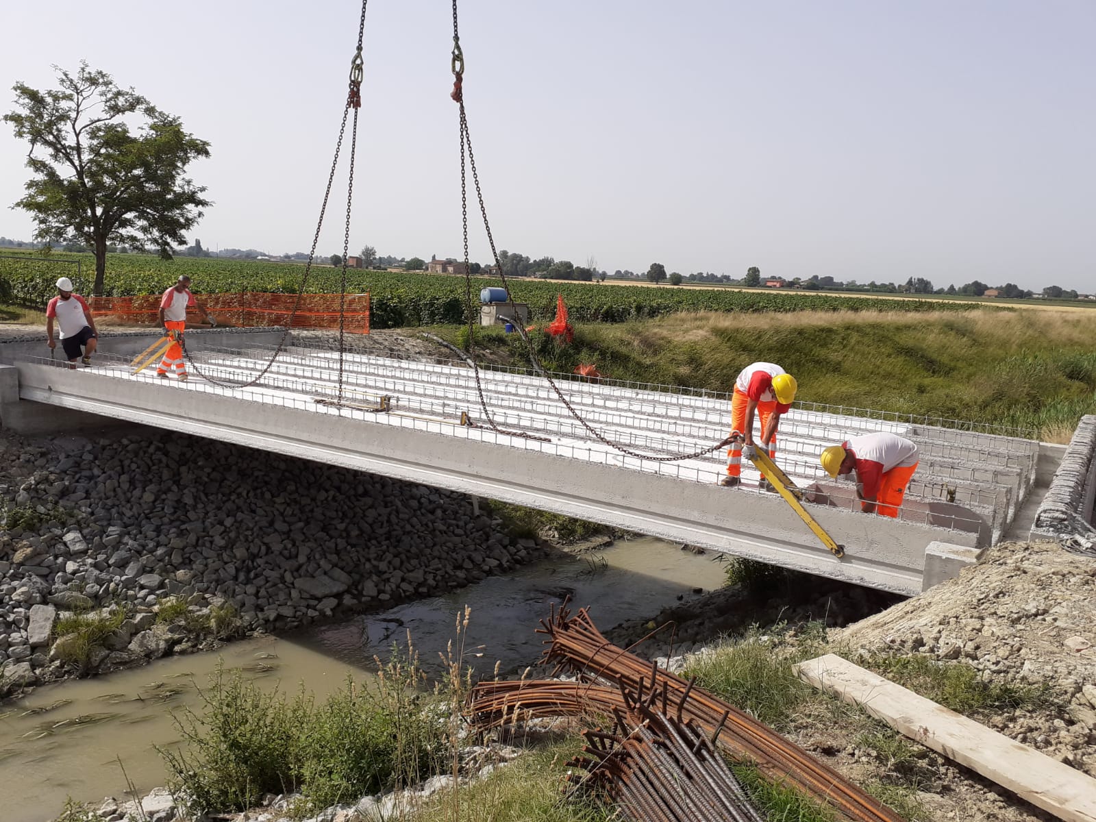 Si valuta di completare e collaudare il nuovo ponte e riaprirlo alla fruizione nel corso dell’estate. I lavori, la cui direzione è dell’Ufficio Tecnico del Comune, sono eseguiti dalla ditta Zini Elio s.r.l. di Imola che ha realizzato una struttura in calcestruzzo armato e calcestruzzo armato precompresso per rispondere ai requisiti richiesti dalla recente normativa tecnica delle costruzioni in materia sismica. Dopo il varo delle travi nei prossimi giorni verrà eseguito il getto di completamento dell’impalcato. A seguire la posa del pacchetto stradale e le opere di finitura.